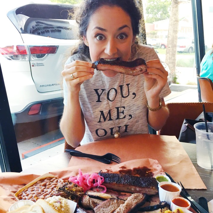Like any good barbecue menu, Lewis’ is simple, straightforward, and heavy with the meats. Beef brisket, beef short ribs, pork spare ribs, pulled pork, turkey breast, and Texas “hot guts” (sausage) are just a few of his meaty offerings. Naturally, I wanted to taste a little bit of everything to say I’d had the full Texas barbecue experience. So my fellow foodie friend and I asked for “one of everything”. I wish I was kidding, but Charlotte and I ate the biggest plate of meat and sides I’ve ever seen and it was everything we’d hoped for and more.