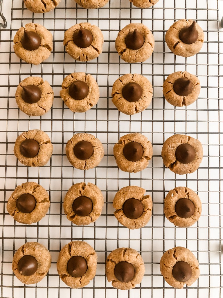 6. Once cookies are baked, remove from oven and lightly press a chocolate kiss into the center of each cookie. Let cool for 5 minutes on the baking sheet before transferring to a wire cooling rack. Let chocolate harden before serving.