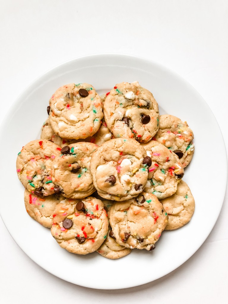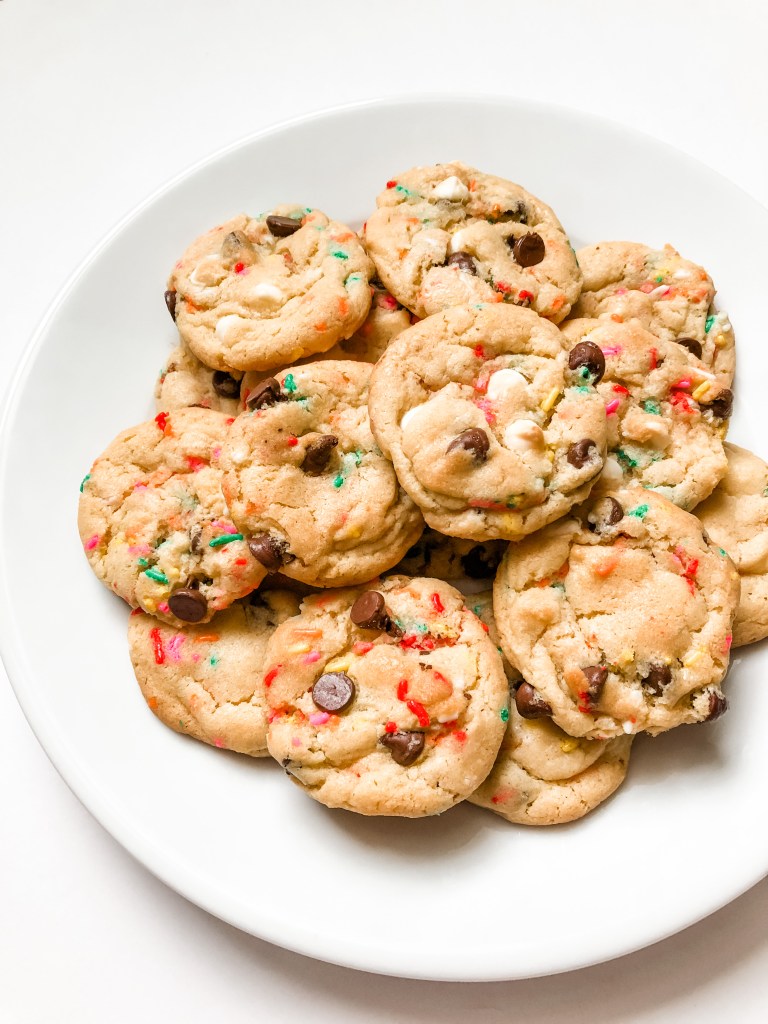 These cookies are phenomenal! I’ve only made them once, but they’re already proving to be a favorite. Crunchy outside, chewy inside. Milk and white chocolate chips with gobs of sprinkles. Yep, sounds like perfection to me! The best part is you can pick whatever cake mix and sprinkle combination you want. I used yellow cake with multi-color sprinkles for the cookies I featured below. But whether you’re celebrating V-Day, Christmas, or Tuesday, the possibilities are endless.
