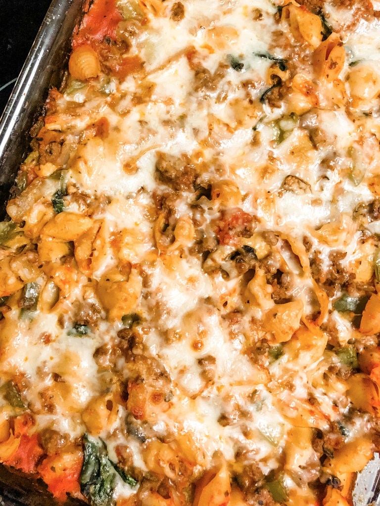 5.Once the diced veggies are sufficiently cooked (5-7 minutes), add in the spinach and cook until slightly wilted. Add cooked veggies and ground beef to the casserole dish with the pasta and sauce. Thoroughly mix while adding the Parmesan cheese and half the Mozzarella cheese.