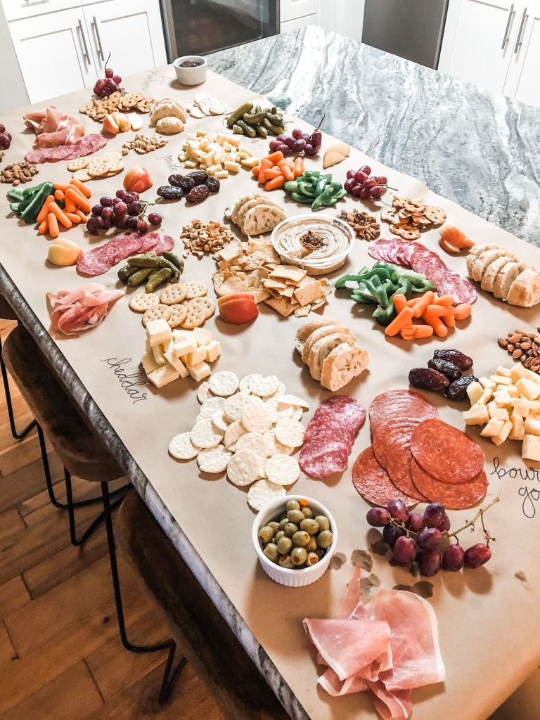 You can’t have proper charcuterie without the right board! There are so many to choose from: rectangular boards, square boards, circular boards. And then you have to pick the material: wood, marble, or a mixture of the two. Depending on the event, number of people, or theme, you need a board that corresponds and can fit all you wanna offer to your guests. I have a couple that I love and use for varying occasions. Truly, you can never have too many charcuterie boards! But if your spread is too big and bountiful to fit on a board, kraft paper on a large flat surface is a fabulous alternative.