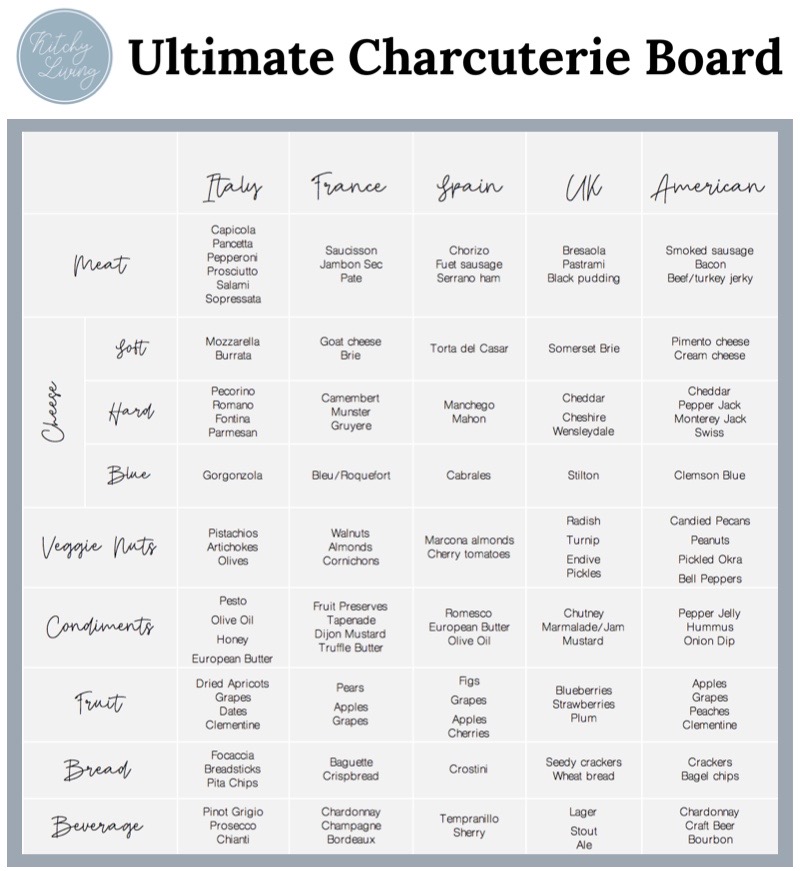 I’m proud to say this is the most comprehensive list of charcuterie board necessities I’ve ever created. I heard a long time ago that the best way to build a charcuterie board is by country. This ensures that you achieve complementary pairings and flavors. You by no means have to buy EVERY. SINGLE. ITEM. for each country’s board, however it gives you a great jumping off point for creating your next entertaining masterpiece.