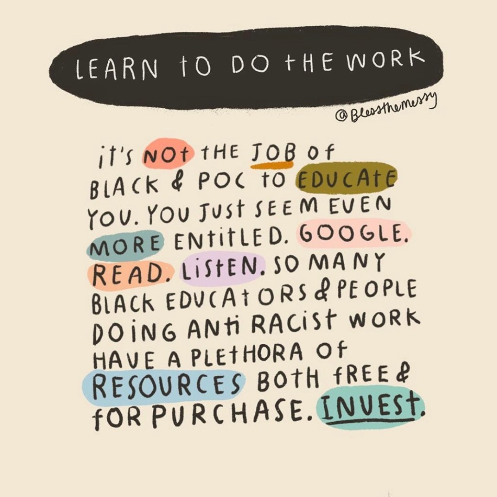 Listening is one of the most under-utilized tools we have in our toolbox. Too often I think that action is the only way to make a difference, however listening and asking thoughtful questions can lead to enlightening conversations. People want to be seen and heard, and listening does just that. Listen to the stories of those who’ve been oppressed. Choose to follow people on social media that challenge your biases, worldviews, and societal norms. And when you hear something that resonates with you, amplify it by educating those around you. Our own prejudices and biases come from lack of knowledge and understanding, so what better way to uproot injustice than by planting seeds of truth. And finally after lots of listening and educating, we act! Use your unearned benefits to benefit the POC around you. Stand up for your co-worker, neighbor, or friend whose being treated differently based on their racial identity. Advocate for them when you can. Commit yourself to allyship and intentionally seek out opportunities in your community to create change.