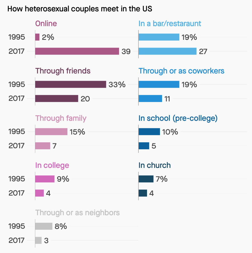 As you can see, online dating is quickly becoming the most popular way for people to meet their partner/SO. Even just within the past couple of decades, conventional/traditional ways of meeting people have become less popular. Why? Well I think there are many contributing factors. In Aziz Ansari’s book, Modern Romance, he comically tackles the topic of modern love in our culture and how it’s changed so dramatically over the past century. It does have some language in it (so you’ve been forewarned), but it’s a great read if you’re looking to better understand how our modern concept of dating came into existence.