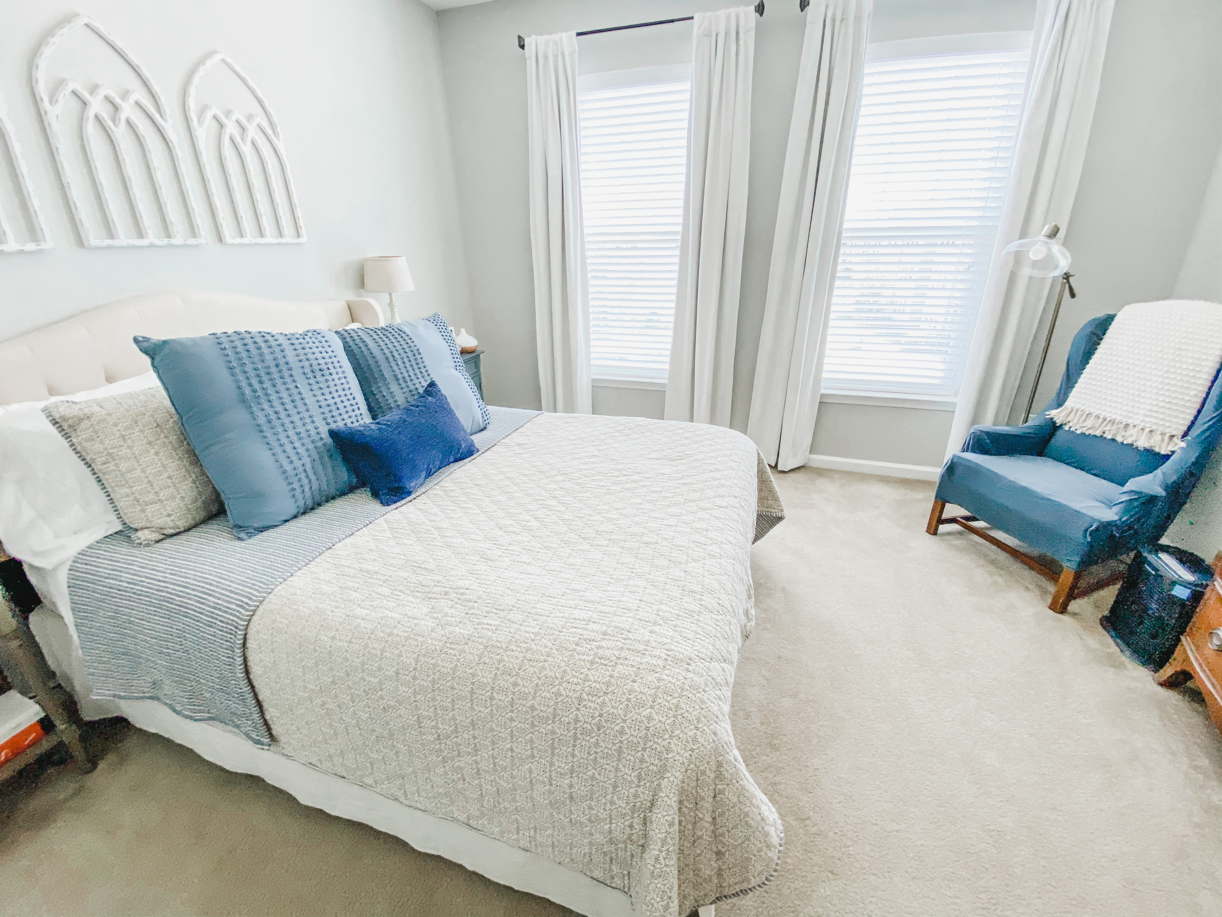 Hard to believe we moved into our little Myrtle Beach home a year ago! What a crazy 12 months it’s been…My husband and I started new careers in the medical field and hospitality industry, got plugged into a local church family, and are everyday learning how to maneuver through marriage. But our master bedroom is our sanctuary! It’s our cozy retreat at the end of a long workday. Warm neutrals with hints of navy, white, and slate blue.