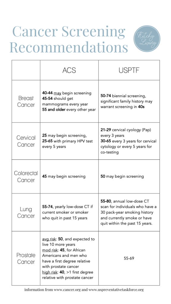 Here is my comparison chart from my Let’s Talk Cancer Screenings post according to the ACS and USPTF. Check out the post for details on the top cancers in our world today and when/how to screen.