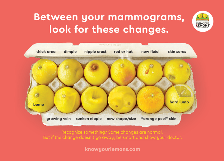 This infographic is a great illustration of some abnormal breast changes that require follow-up with your doctor. Changes like thickness, dimpling, nipple crust, redness or warmth, new fluid production, skin sores, bumps, veins, retracted nipples, abnormal shape, orange-peel skin, and hard lumps.