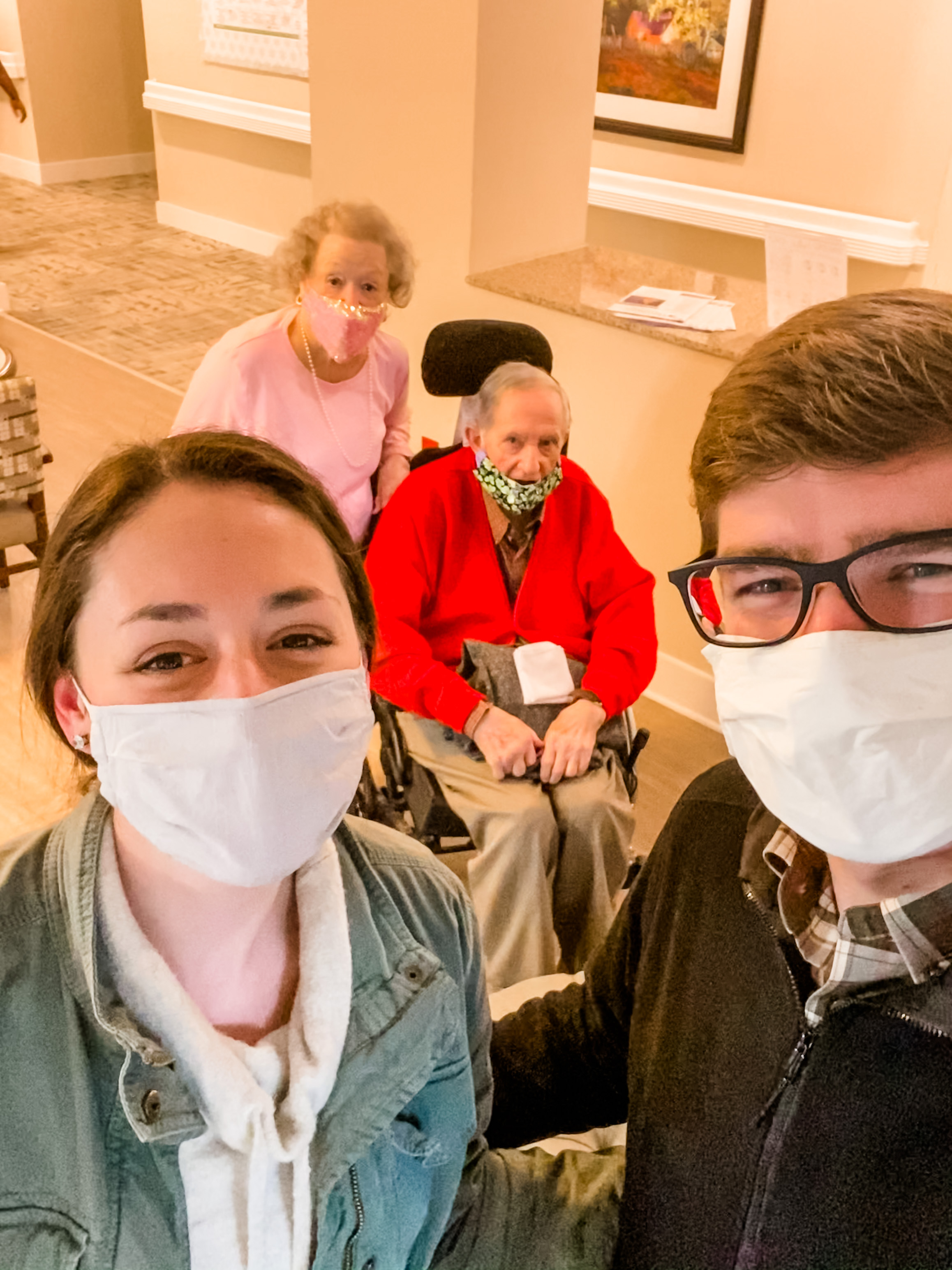 Charleson, SC: Went to visit my grandparents at their assisted living facility. Hadn’t seen them since New Years of this year! Their facility went on lockdown after COVID hit, and there has been very limited access to family and visitors. We got a whole hour together to exchange Christmas gifts and reminiscence on the past few months. I sure do miss these two, but I’m thankful that their staff is taking such good care of them.