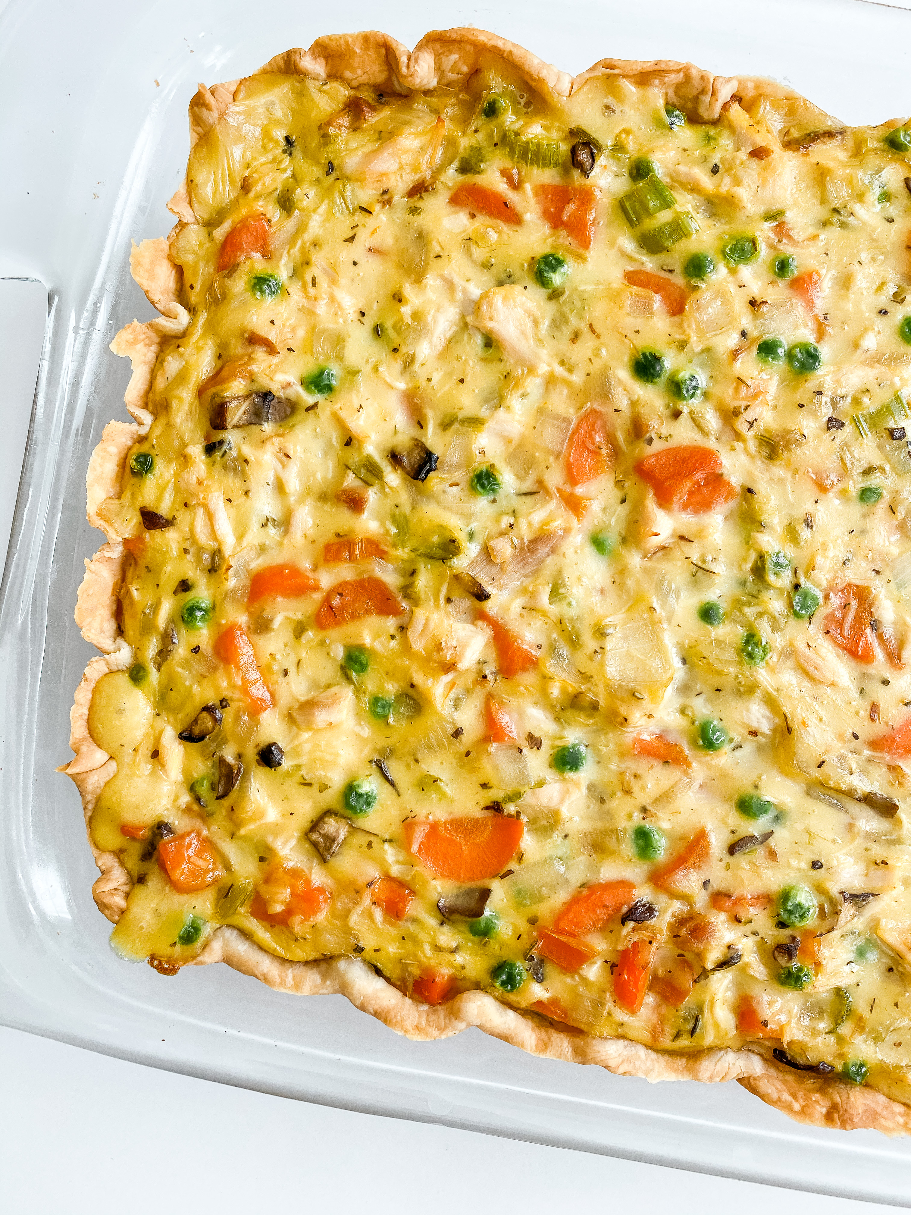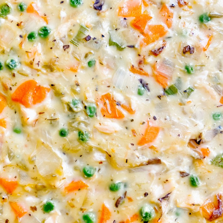 Chicken Pot Pie is one of those dishes that gives me all the warm fuzzy feels. It was one of my favorite meals growing up, and was probably my most requested dinner dish whenever I came home from college. My version of my mom’s Chicken Pot Pie is likely very similar to her’s except it has mushrooms in it. Also, you can add more pie crust to the top and weave it for a more classic Chicken Pot Pie, however in the interest of saving some calories, I nixed the top crust. Honestly, I think it looks more tasty without it!