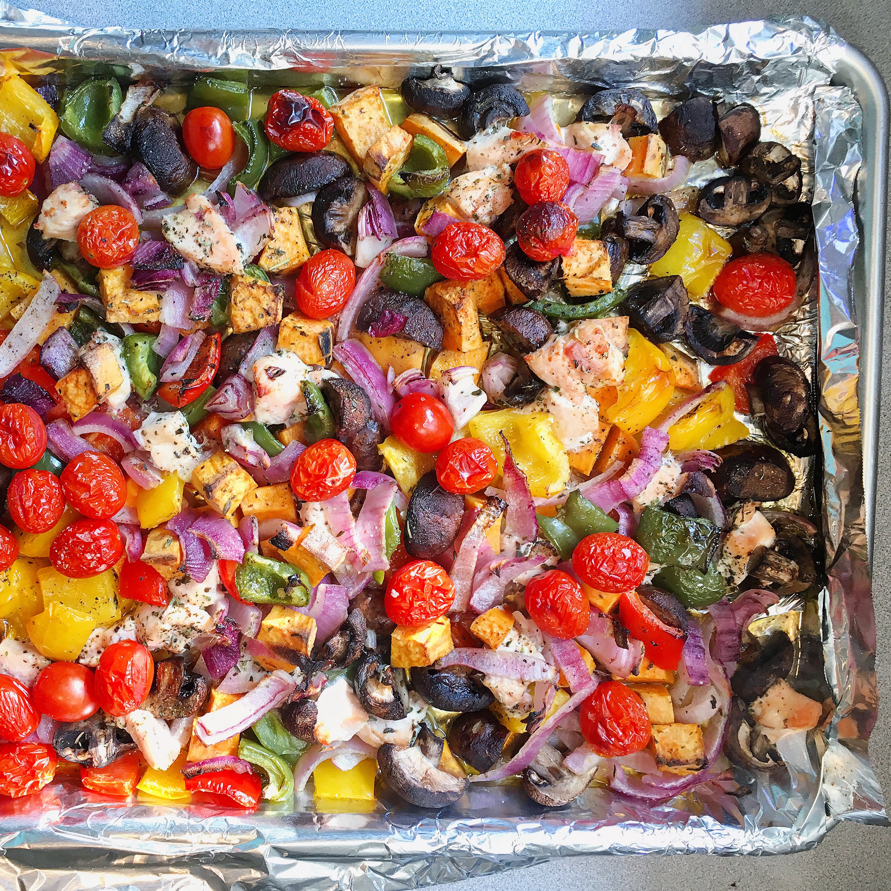 THREE: Chicken, Sweet Potatoes, Red Onions, Mushrooms, Grape Tomatoes, Bell Peppers