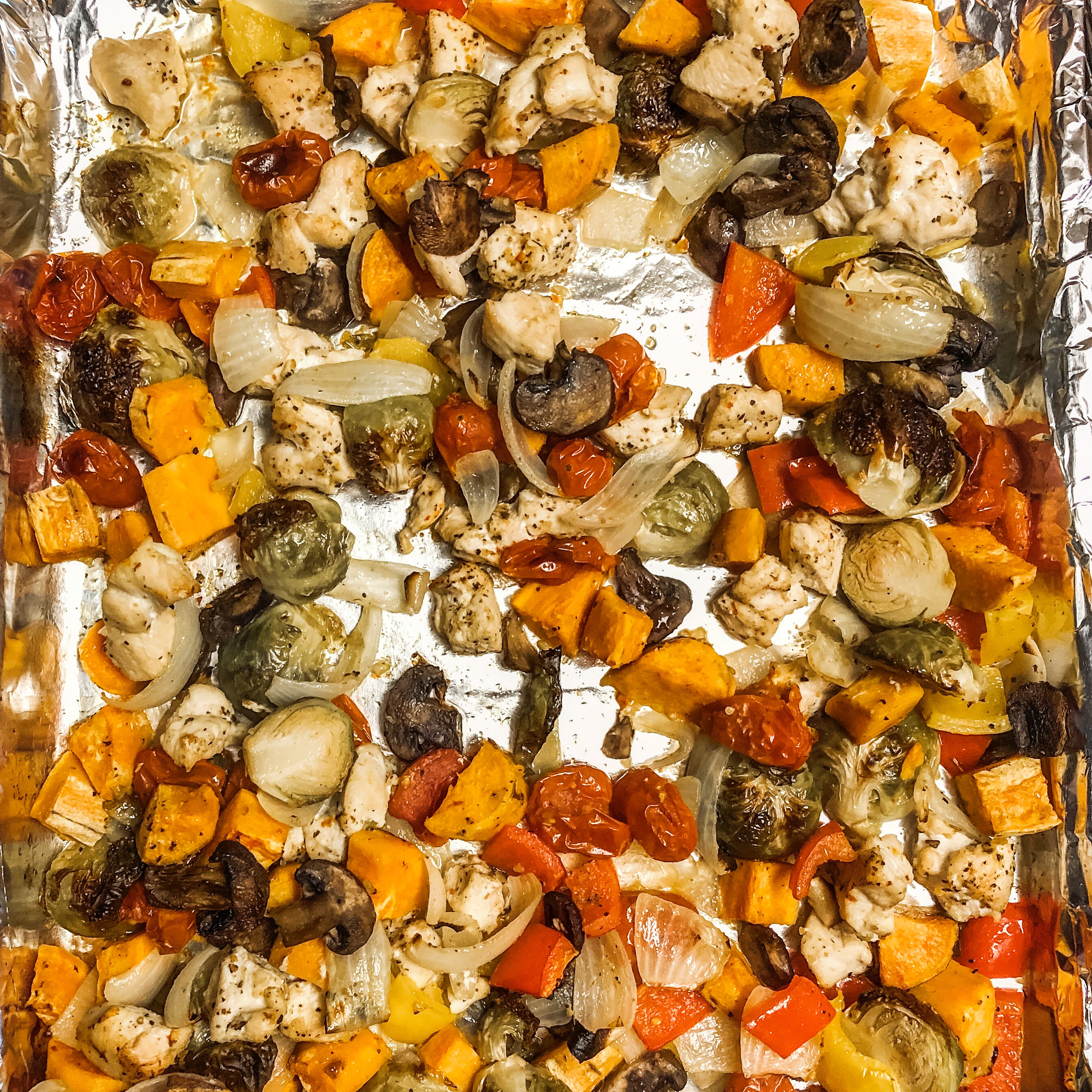 TWO: Chicken, Brussel Sprouts, Sweet Potatoes, Cherry Tomatoes, Onions, Bell Peppers, Mushrooms