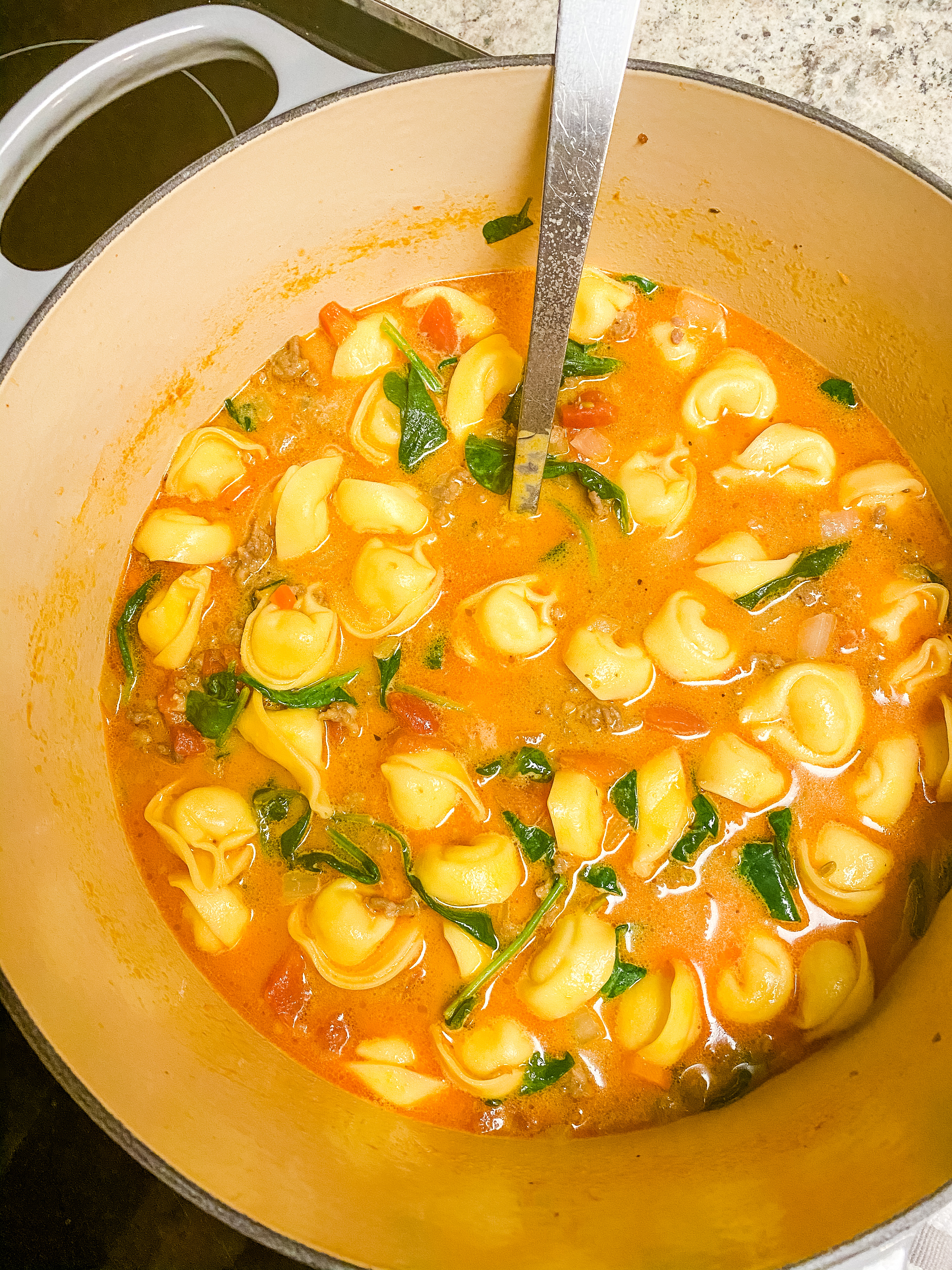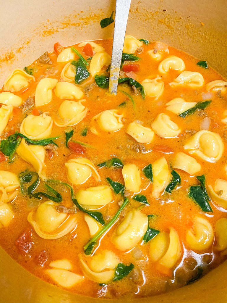 4. Add spinach and tortellini. In a food processor add 1/2 cup of the broth with cream cheese and blend. Add back into the soup pan and stir until incorporated.