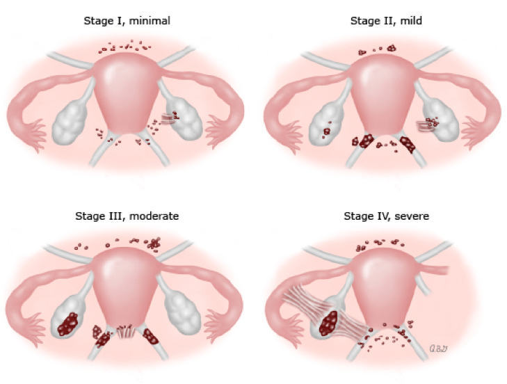 Stage IV (>40 points): severe, many deep implants, large cysts on one or both ovaries, many dense adhesions