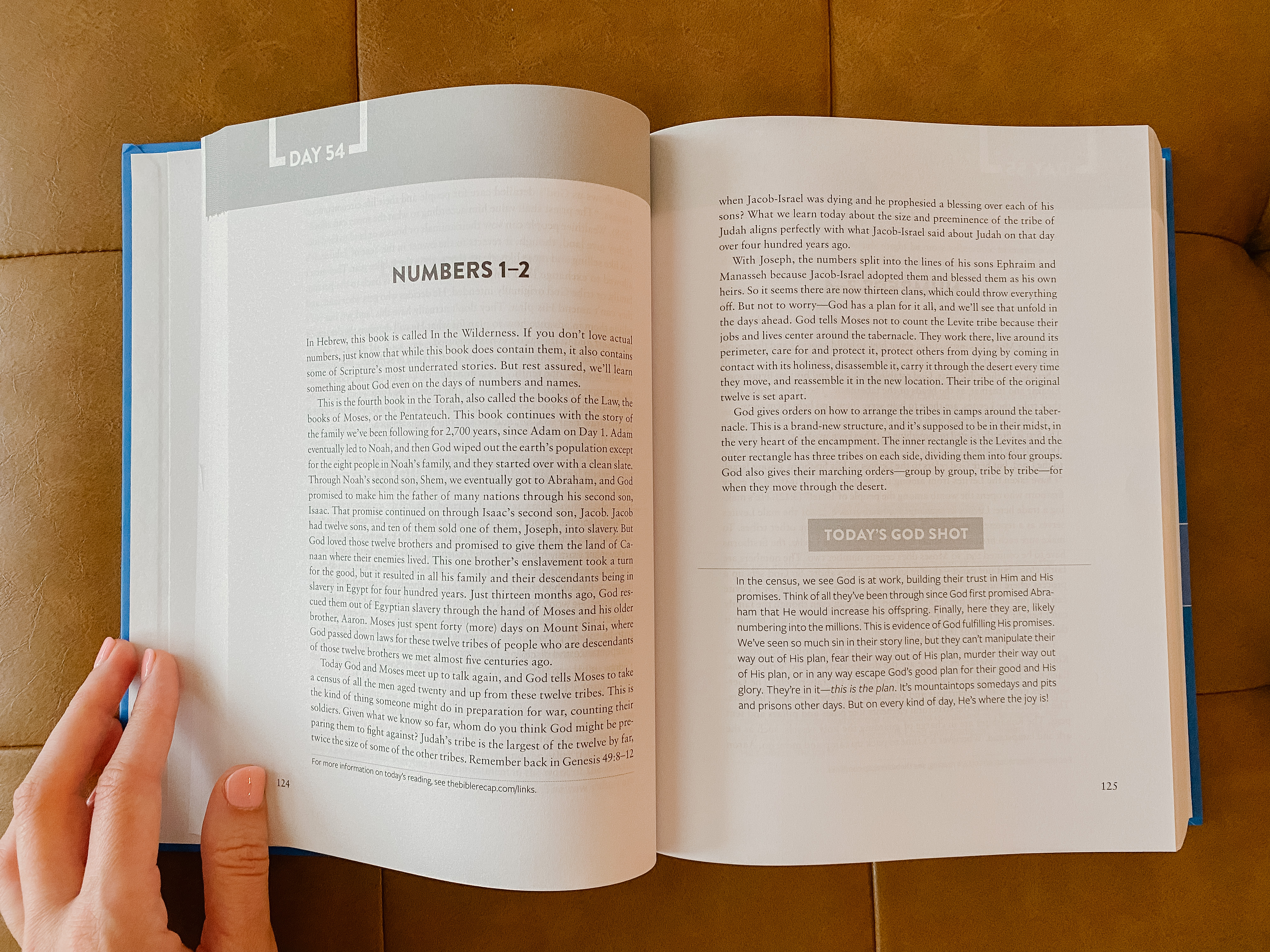 If you’re more of a visual learner, get your hands on The Bible Recap Book. It’s essentially the podcast in book form, and it’s the perfect complement to the reading plan. I love using it while I read the podcast. It offers a brief synopsis of the daily bible readings with context and application. If you love holding a physical book when studying, then this is what you need.