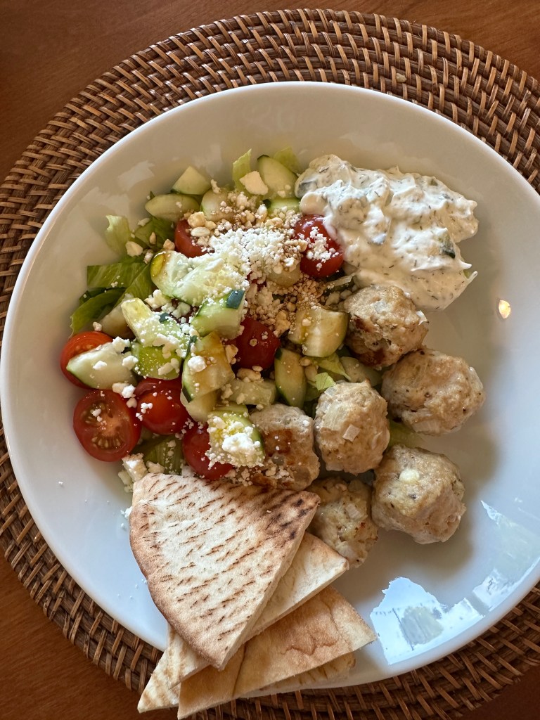 My husband and I love these Greek Chicken Meatball bowls! You leave the meal satiated without feeling bloated and overly full. Add some homemade or store-bought tzatziki sauce and wham-bam this meal is on fire. The perfect proportion of veggies, protein and carb!